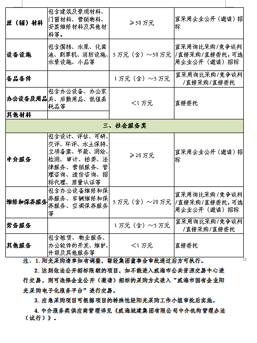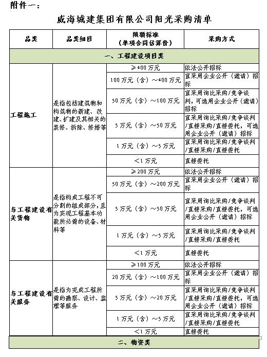 第十七條 本制度規(guī)定的采購范圍包括工程建設(shè)項目、物資和社會服務(wù)的招標(biāo)采購(詳見附件一《威海城建集團有限公司陽光采購清單》)。