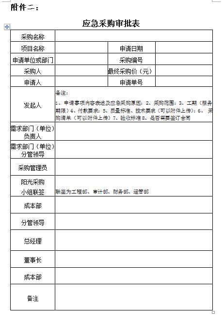 第二十二條 應(yīng)急采購經(jīng)需求部門(單位)負(fù)責(zé)人、分管領(lǐng)導(dǎo)、總經(jīng)理同意后由需求部門(單位)直接采購;事后由需求部門(單位)提交《應(yīng)急采購審批表》(詳見附件二),說明應(yīng)急采購的具體原因經(jīng)評審?fù)ㄟ^后,財務(wù)可直接付款。如果評審后認(rèn)定該事項不屬于應(yīng)急采購的,參照本制度第七章工作紀(jì)律進行問責(zé)。