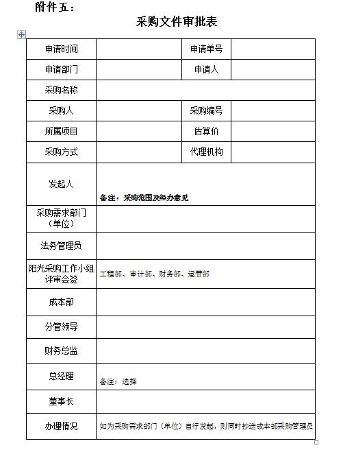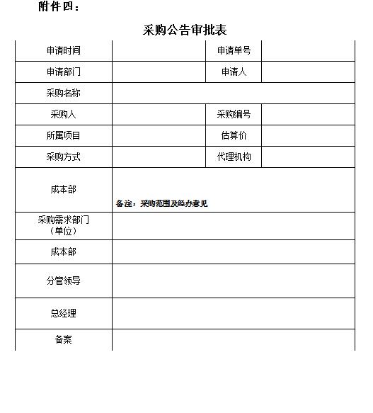 3.工作流程:需求部門(單位)提報《采購申請表》,按規(guī)定程序?qū)徟ㄟ^后,由成本部委托招標(biāo)代理機構(gòu)具體實施。